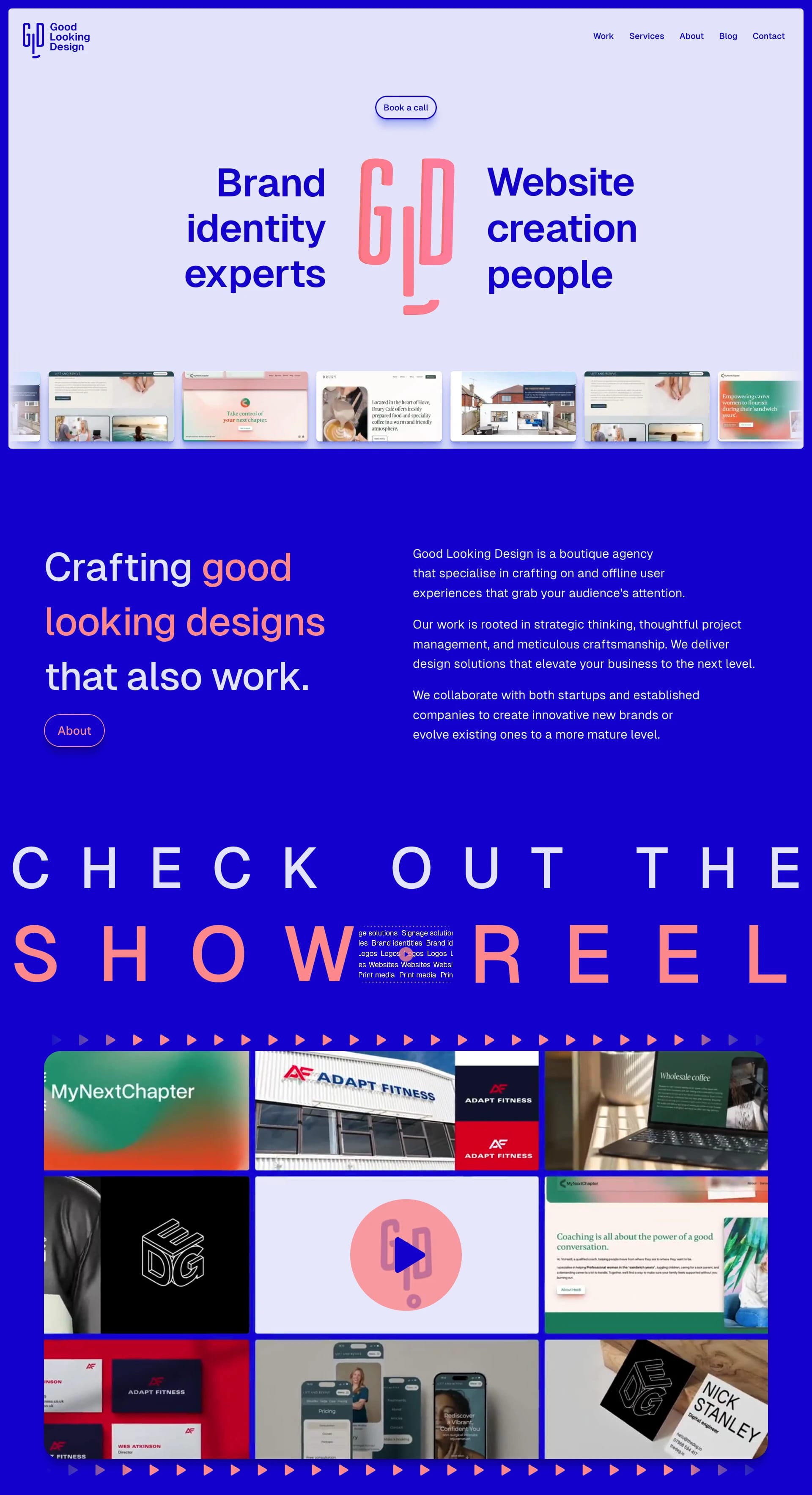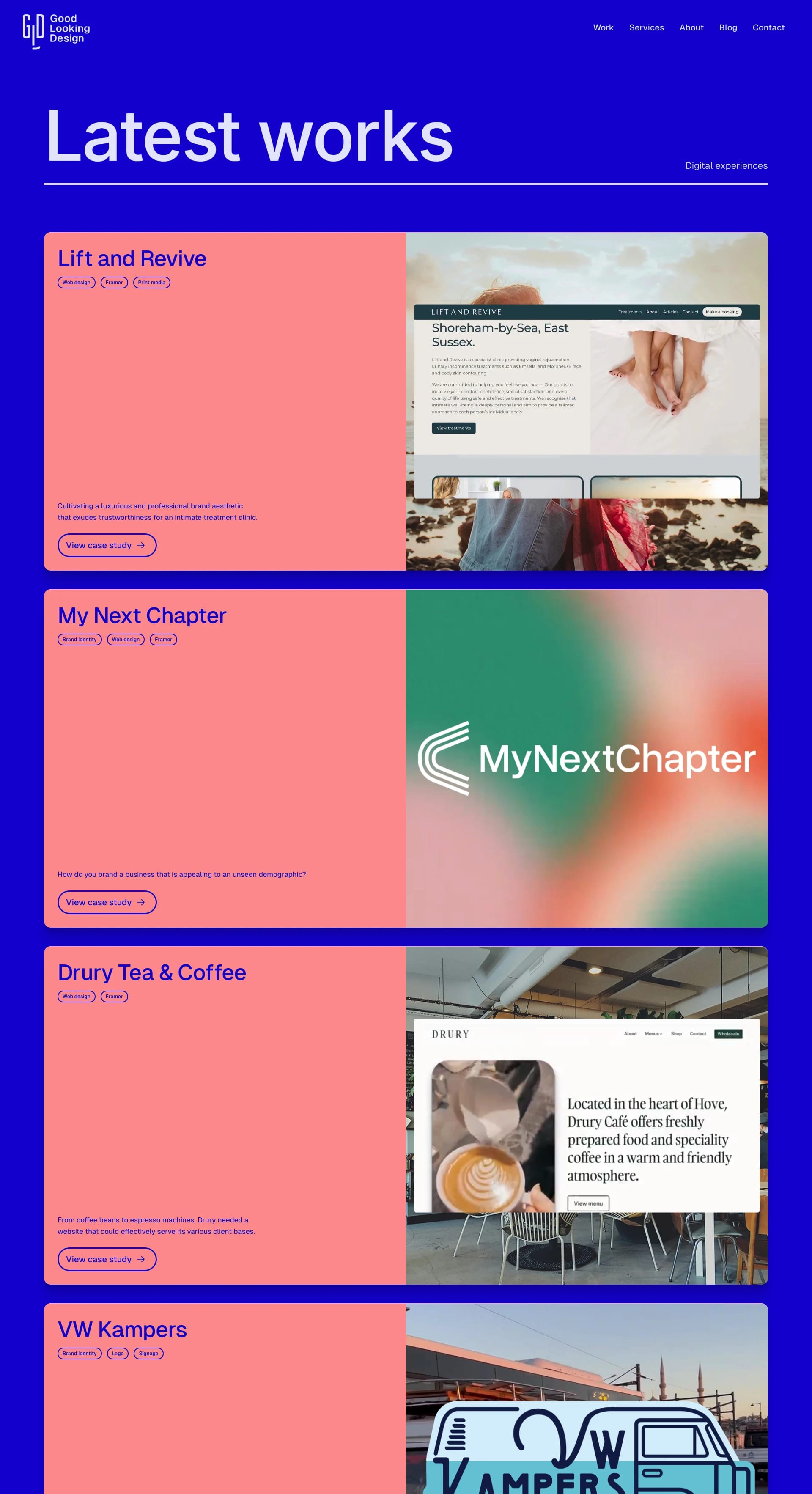 This landing page for a design agency uses a refreshing blue and coral color palette to create a modern and inviting aesthetic. The clean design and concise messaging effectively communicate the agency's brand and services.